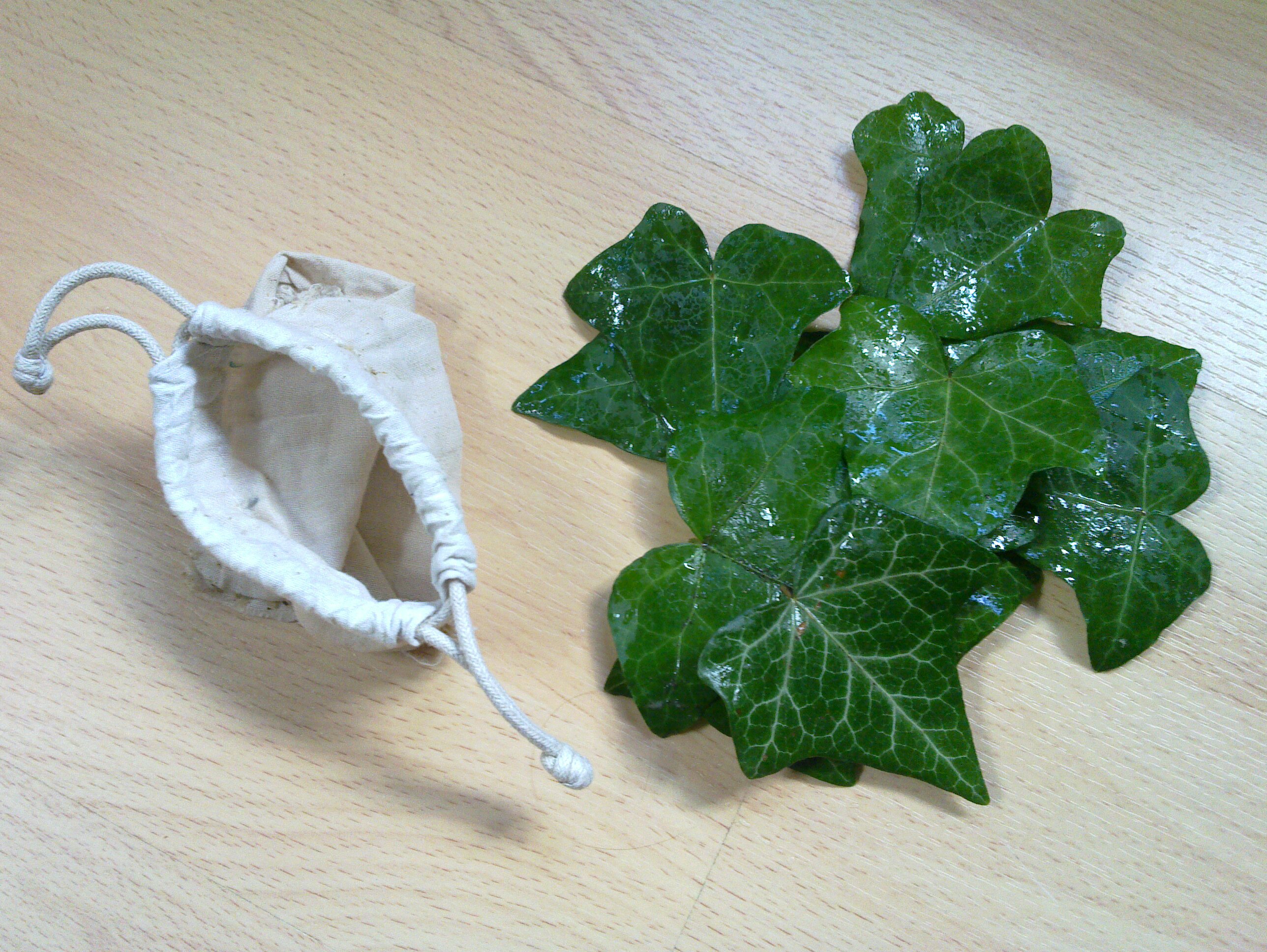 Seit ein paar Wäscheladungen teste ich gerade ein plastikfreies Waschmittel -> Efeu. Genau. Das grüne Zeug, was an jeder Ecke wuchert. Das kann man sich das ganze Jahr über pflücken. Efeu ist eine hervorragende Alternative zu herkömmlichem Waschmittel. Ich habe eine handvoll Blätter Efeu in ein Wäschesäckchen gegeben und damit eine Ladung Waschmaschine im Kurz-Waschgang mit 40°C gewaschen. Wer kein Wäschesäckchen hat nimmt eine Socke. Die Wäsche war sauber und roch neutral, d.h. hatte keine schlechten Gerüche mehr. Das ganze funktioniert weil Efeu Saponine enthält, d.h. Seifenstoffe.